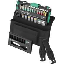 Cykelverktygssats med spärrhandtag, bits, hylsor och ett bitshandtag i superkompakt Tool-Check. Perfekt som universallösning för en mängd olika skruvningstillämpningar. Bitshandtag av hög kvalitet med Kraftform Plus-grepp för bekvämt ergonomiskt arbete, utan blåsor och valkar. Hårda greppzoner för hög arbetshastighet, mjuka greppzoner för hög momentöverföring. Bitsspärrhandtag för snabbt arbete när skruvning med maskin eller konventionellt handverktyg inte är möjligt på grund av utrymmesbrist. Växla snabbt från vänster- till högerrotation och vice versa med omkopplingsspaken. Snabb rotation (med tummen) via räfflingen på spärrhuvudet. Enkel hantering med bara en hand. Ergonomiskt spärrhuvud/-handtag: Kraftform-geometri med perfekt formade anliggningsytor för fingrarna. Den direkta bitsfattningen i spärrhuvudet gör verktyget utpräglat lågt och det kan användas vid låga arbetshöjder. Liten returvinkel på 6° för precist arbete. Robust sänksmitt helstålsutförande. Moment över 65 Nm. Bitshållaren Rapidaptor med frihjulshylsa: Kan användas som förlängning, för blixtsnabba bitsbyten utan behov av hjälpverktyg, även de minsta bitsstorlekarna, med bara en hand. Bits (BTZ) med BiTorsion-zon för avfjädring ab belastningstoppar för universell användning. Seghärdade bits (Z) för universell användning. Hand- och maskinhylsor för så gott som alla tillämpningar. Med verktygsväljare Take it easy, med färgkodning efter storlek - för enkelt och snabbt val av rätt verktyg. Enkel att greppa, även med oljiga händer. Med kulspärrspår. För sexkantsskruvar och -muttrar. Av mattförkromat krom-vanadin-stål. Med glasfiberarmerade däckavtagare kan däcken enkelt lossas från fälgen utan att fälgen skadas. På turen kan ett urval verktyg tas med i den medföljande Bit-Check. Med robust verktygsfodral.