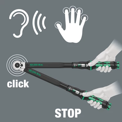 När det inställda momentvärdet har uppnåtts utlöses en hör- och kännbar mekanism.