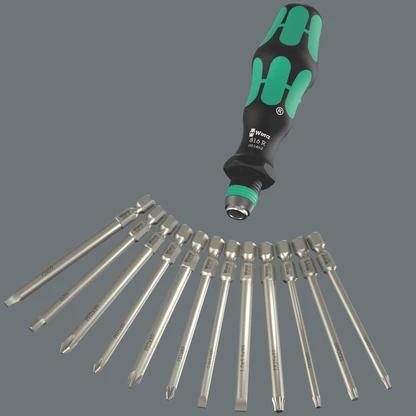 Vikfodral med 89 mm långa bits. Inklusive momentskruvmejsel 7441 med snabbfäste "Rapidaptor" och flerkomponent Kraftform-grepp för utmattningsfritt arbete. För hand- och maskinskruvning. 17 delar. Kompakt grepp-/växelklingsystem för momentkontrollerade förskruvningar. Inklusive momentskaft 7441, inställbart från 1,2 till 3,0 Nm. Inställbar i steg om 0,10 Nm. Enkel inställning av önskat moment utan specialverktyg. God läsbarhet för skalvärden. Rapidaptor snabbväxlingsteknik för blixtsnabba bitsbyten. Obegränsat lossningsmoment för lossning av hårt sittande skruvar. Flerkomponents Kraftform-grepp med hårda och mjuka greppytor för hög arbetshastighet och som skonar handflatorna. Inklusive 16 bits med 89 mm längd. Med praktiskt vikfodral för översiktlig förvaring.