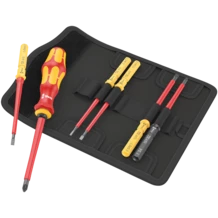 1 handtag 817 VDE Kraftform och 6 VDE-växelklingor med verktygsväljare Take it easy: Färgkodning och lasergraverad storleksmärkning. Enskilt kontrollerade verktyg enligt IEC 60900: enskild kontroll vid 10 000 V för säkert arbete vid den tillåtna spänningen 1 000 V. I robust bältesfodral. Textilfodralet har en öglezon på baksidan. Textilfodralet kan fästas på Wera 2go-komponenterna med de medföljande kardborrebanden. Kan även fästas på vägg, hylla eller verkstadsvagn.